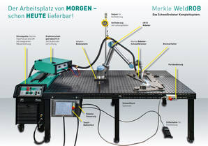 Merkle demonstriert mit seinem System WeldROB eine einfache, kostengünstige Komplettlösung zum Roboterschweißen, einsetzbar auch bei kleinen Losgrößen und häufig wechselnden Bauteilen. Das System WeldROB beinhaltet neben einem UR10 Roboter alle zum MIG/MAG- und PulseARC-Schweißen benötigten Komponenten, ist leicht programmierbar und flexibel einsetzbar.