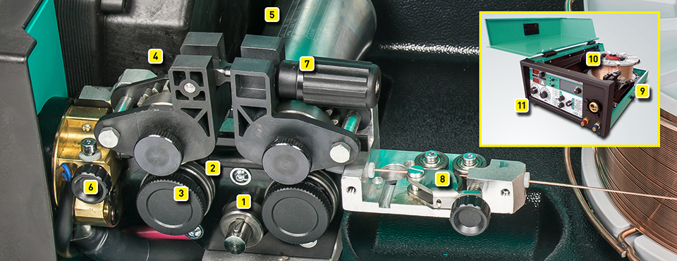 2. Große Drahtvorschubringe ermöglichen perfekten Drahttransport mit geringem Anpressdruck. Jeweils 2 Nuten für 2 verschiedene Drahtstärken pro Drahtvorschubring vorhanden.