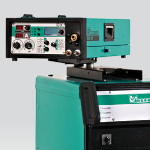 Das separate Drahtvorschubgerät kann drehbar auf der Schweißanlage angeordnet werden. Der Drehpunkt liegt asymmetrisch am hinteren Ende des Drahtvorschubgeräts und ermöglicht einen großen Schwenkbereich. Durch Zugbewegungen am Brenner-Schlauchpaket dreht das DV-Gerät leicht in die gewünschte Position ohne den Brennerschlauch abzuknicken. Aufgrund des hintenangeordneten Drehpunkts wird das Verbindungskabel nur minimal bewegt.