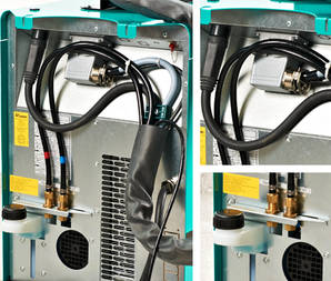 - Mit der praktischen Aufhängevorrichtung (Option) kann die Montage des Drahtvorschubgeräts an einem Schwenkausleger (Sonderzubehör Automatenbauteile) erfolgen. Der Aktionsradius erweitert sich dadurch beträchtlich.